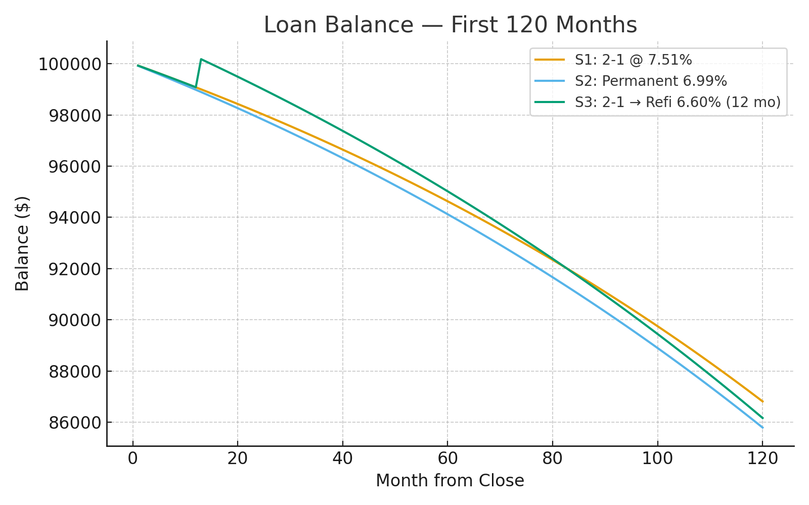 The 2-1 + refi to 6.60% finishes second. You get genuine year-one relief, the benefit of a payoff credit from the unused escrow, and a better note via refinance. The downside is the first 12 months at 7.51% are baked in, and financing $2,000 in fees blunts some of the gain on a $100k balance. There is very little principal paid in the first years.