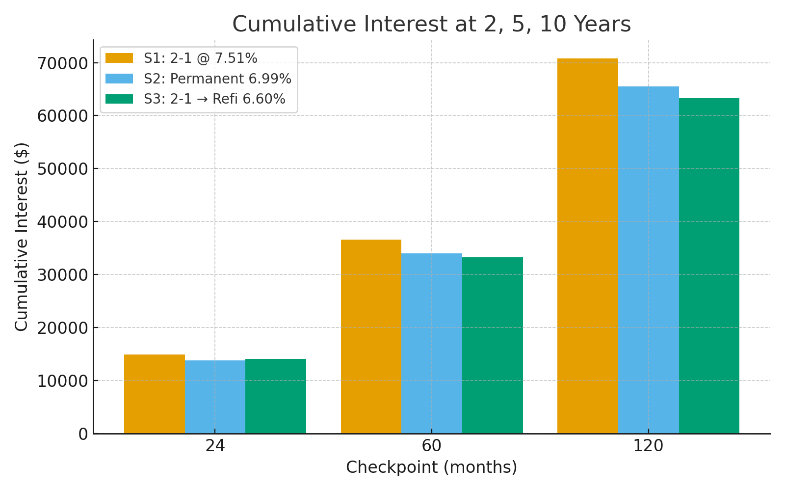 Rule of thumb from this back-test: to beat a 6.99% permanent with a 2-1 then refi, you typically want a refi rate at least 0.50% to 0.75% lower than 6.99% and you want it early enough for compounding to work. 6.60% gets close, 6.35% gets closer, but neither clearly beats a permanent 6.99% at $100k over the mid-term. At $300k to $600k, the math leans more toward the refi as the dollars scale.